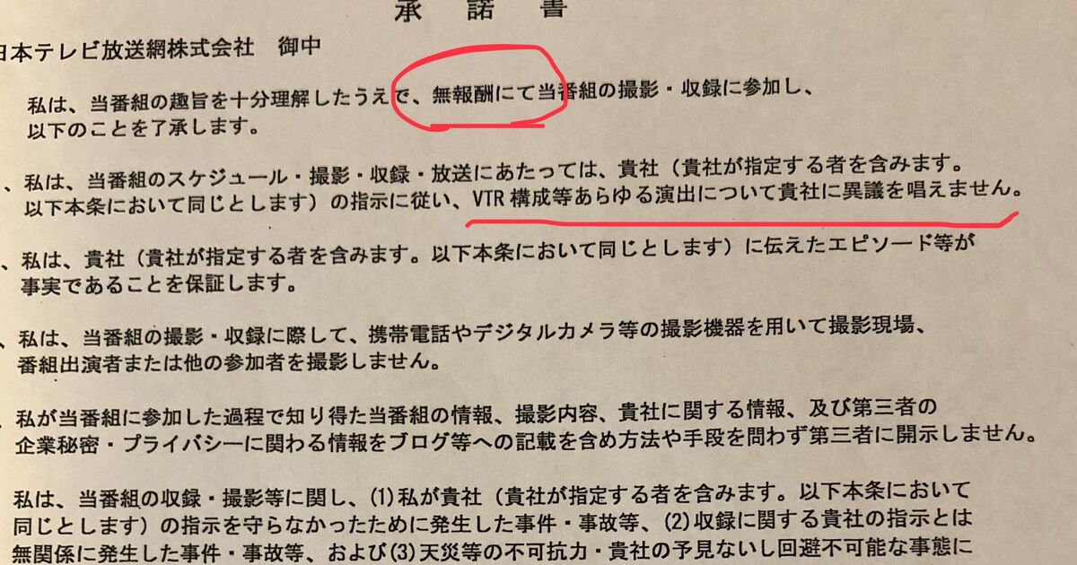 日本テレビ「シューイチ」から依頼され出演したところ、撮影後に無報酬及び番組内容演出に異議を唱えない承諾書を結ばされそうになった - Togetter