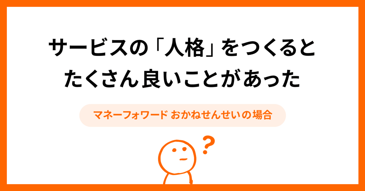 マネーフォワードで新規事業のデザインをしているDOMです。 サービスからの言葉に一貫性を持たせるために、サービスの「人格」をつくったのですが、つくる過程とその後に、たくさんよかったことがあったのでまとめたいと思います。 人格をつくったのは、「マネーフォワード おかねせんせい」です。「すごい!ちゃんと貯...