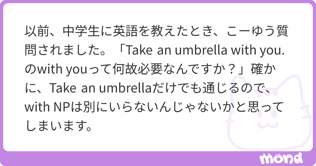以前、中学生に英語を教えたとき、こーゆう質問されました。「Take an umbrella with you.のwith youって何故必要なんですか?」確かに、Take an umbrellaだけでも通じるので、with NPは別にいらないんじゃないかと思ってしまいます。 | mond