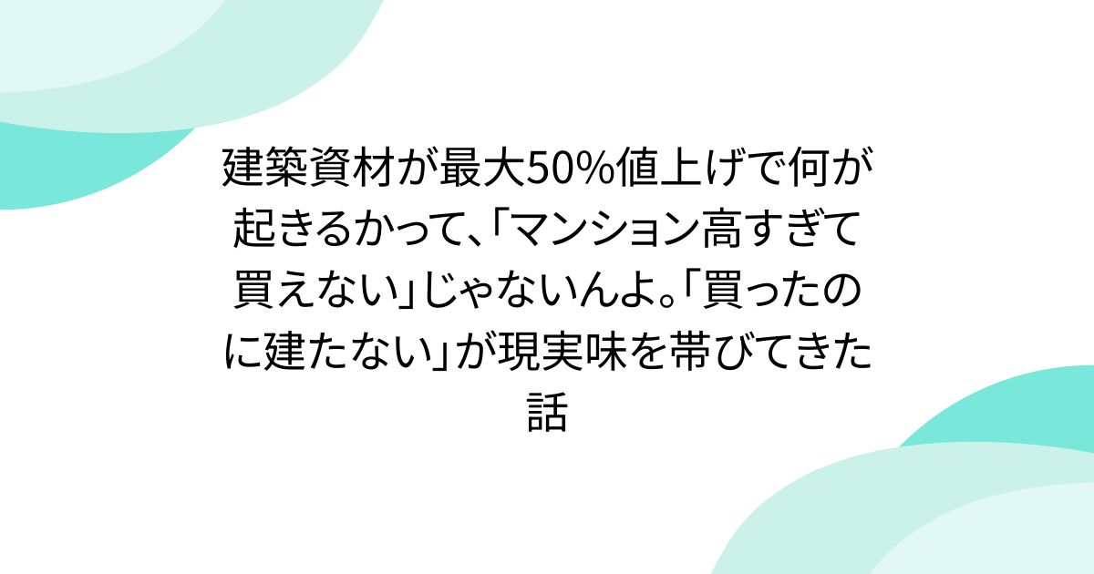 建築資材が最大50%値上げで何が起きるかって、「マンション高すぎて買えない」じゃないんよ。「買ったのに建たない」が現実味を帯びてきた話